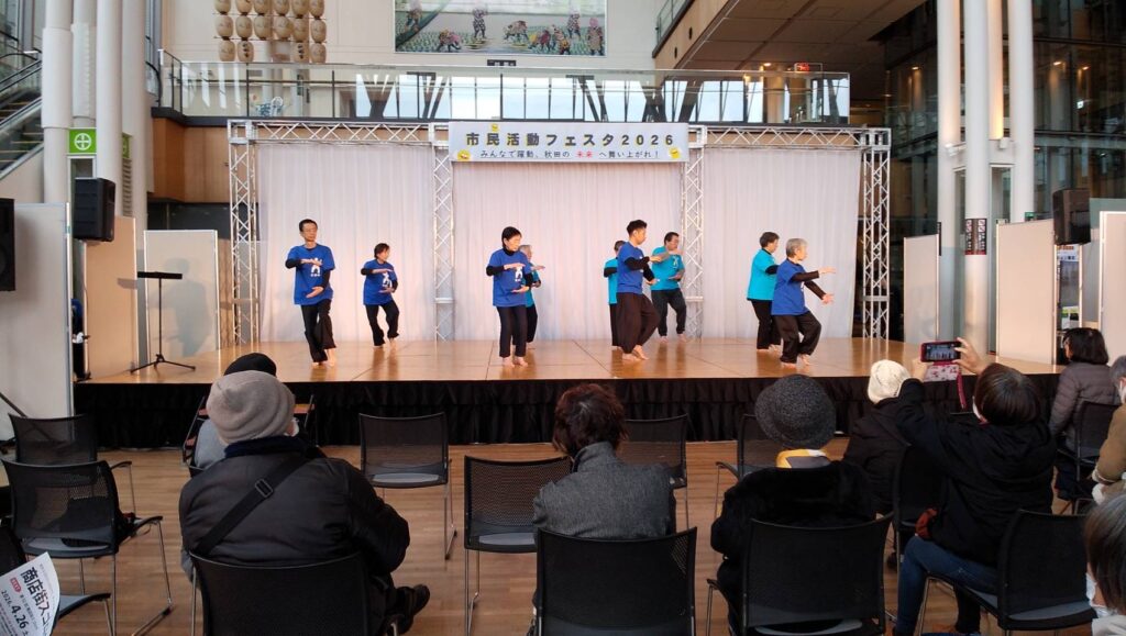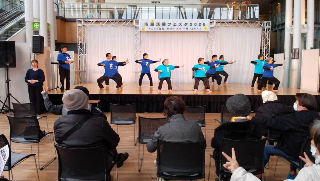 2026年3月8日(日)秋田市アルヴェにおいて、秋田市中央市民サービスセンター主催で開催された「市民活動フェスタ2026」に参加しました。これは秋田市内の市民活動団体(33団体)が一堂に会するイベントで、秋田地区の青澄会がPRブースに出展するとともにPRステージで八段錦(第二段錦)や不老拳を披露し、多くの参加者に楊名時太極拳をアピールしました。
